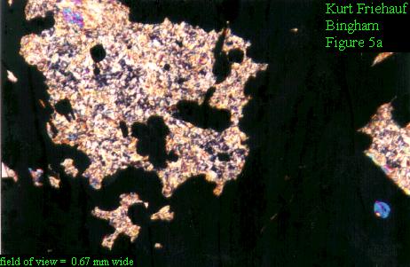 (a.) Transmitted cross-polarized light photomicrograph of fine-grained talc-quartz gangue in specular hematite + pyrite + chalcopyrite ore from the Bingham North Ore Shoot. Note round, high birefringent (second order blue) anhydrite inclusion within pyrite cube on right-hand side, typical of other copper-rich carbonate-hosted massive replacement deposits in other porphyry copper districts. Width of field = 0.69 mm.