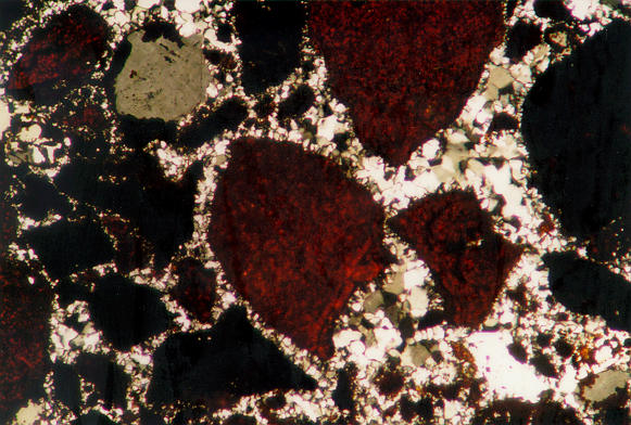 Type III quartz surrounding fragments. Transmitted, cross-polarized light.